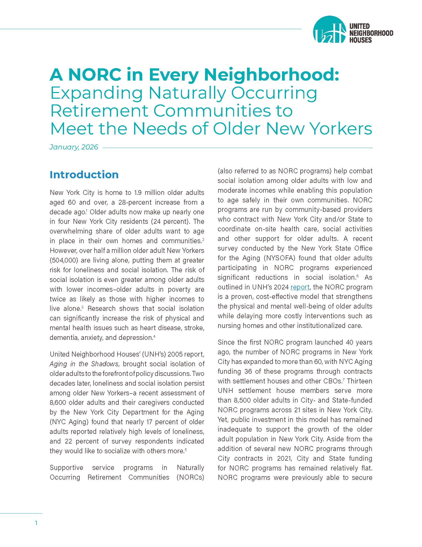 A NORC in Every Neighborhood: Expanding Naturally Occurring Retirement Communities to Meet the Needs of Older New YorkersA NORC in Every Neighborhood: Expanding Naturally Occurring Retirement Communities to Meet the Needs of Older New Yorkers builds on UNH’s 2024 report to highlight the continued need for more NORC programs that help older New Yorkers stay healthier, more engaged, and less isolated. The brief includes an analysis of the New York City neighborhoods without a contracted City or State NORC program that would benefit from the on-site health care and other coordinated support that these programs provide for older New Yorkers. UNH urges the City to invest $10 million in the FY27 budget to ensure that there is a NORC in every neighborhood. |